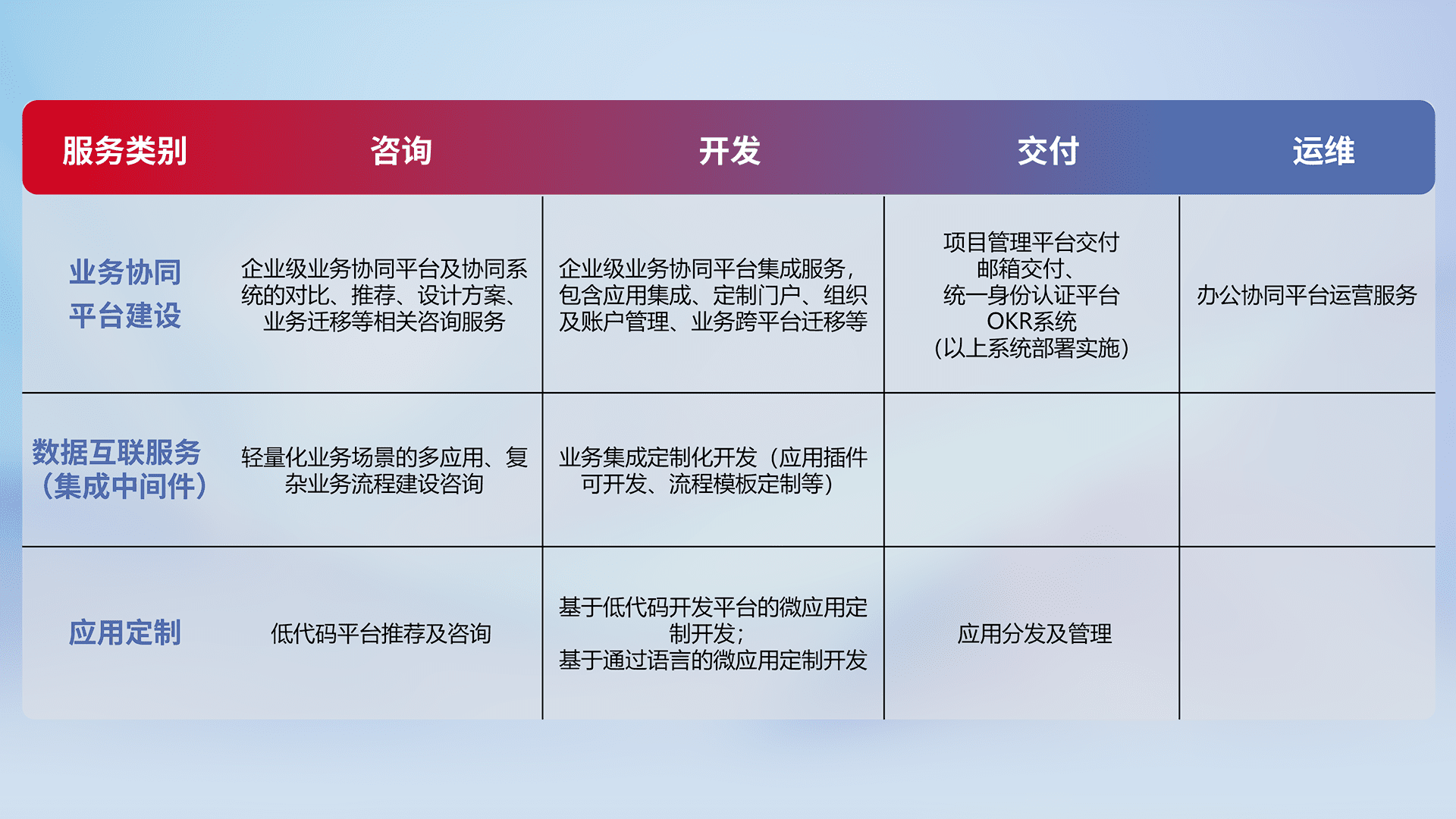 针对钉钉、、、、企微、、、IDaas等平台级产品提供产品的规划、、方案、、、、交付、、、定制化开发等服务,,实现如统一协同办公、、智能客户服务、、、混合会议管理、、、、智能数据查询、、等业务场景,,实现数字化转型。。。。