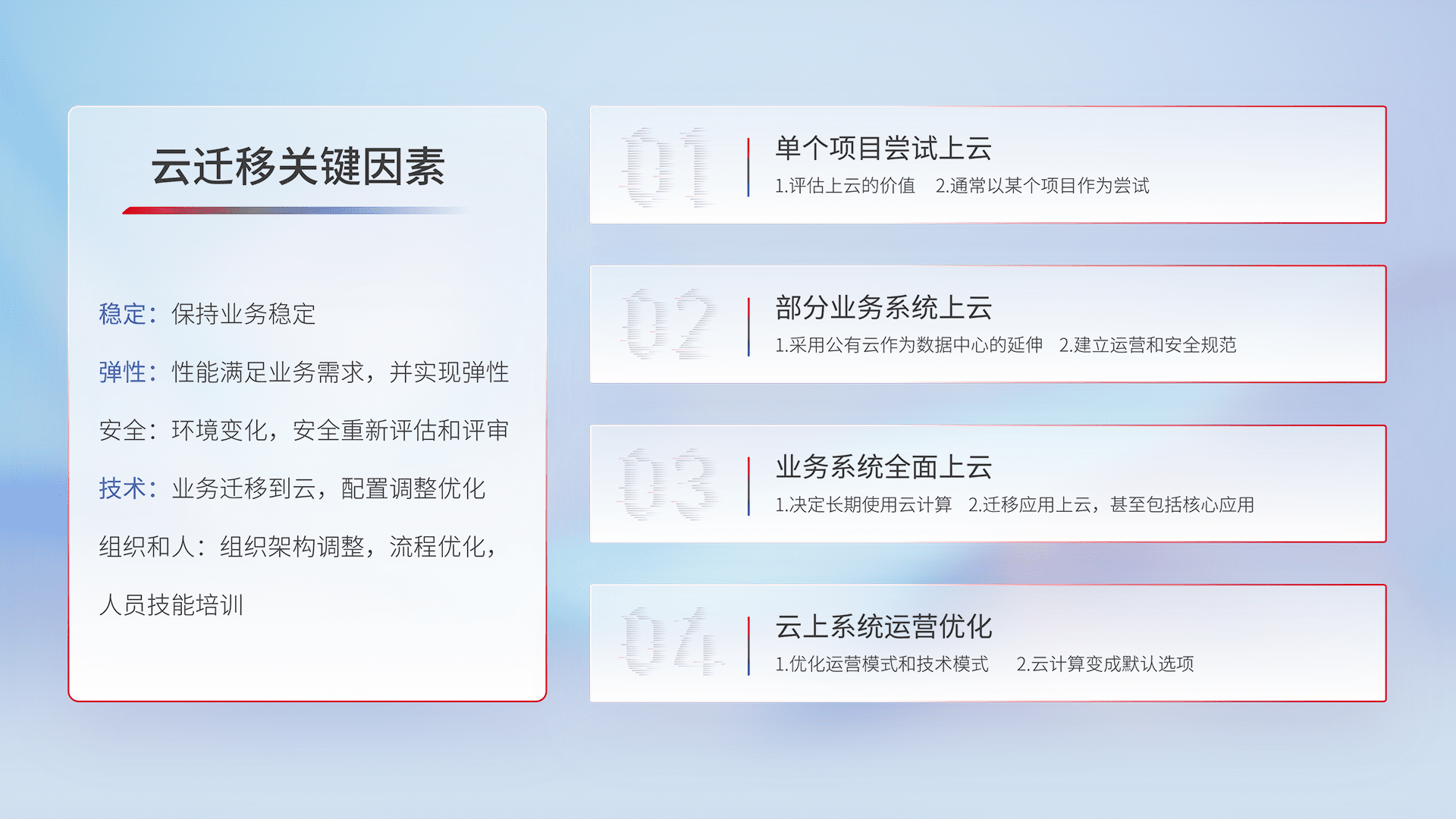 结合实际业务,,,,从规划设计、、、、云平台选型、、、、云原生改造、、、数据迁移、、集成交付,,,迁移全过程为客户识别最佳上云路径,,,做好风险识别管理,,设计网络架构、、、身份权限、、、、安全审计合规、、、操作审计、、、、日志审计、、、、监控告警策略、、多站点容灾设计等,,,,对云上基础设施进行整体规划,,,提升IT治理水平,,,以满足弹性、、高可用、、高性能的需求。。。