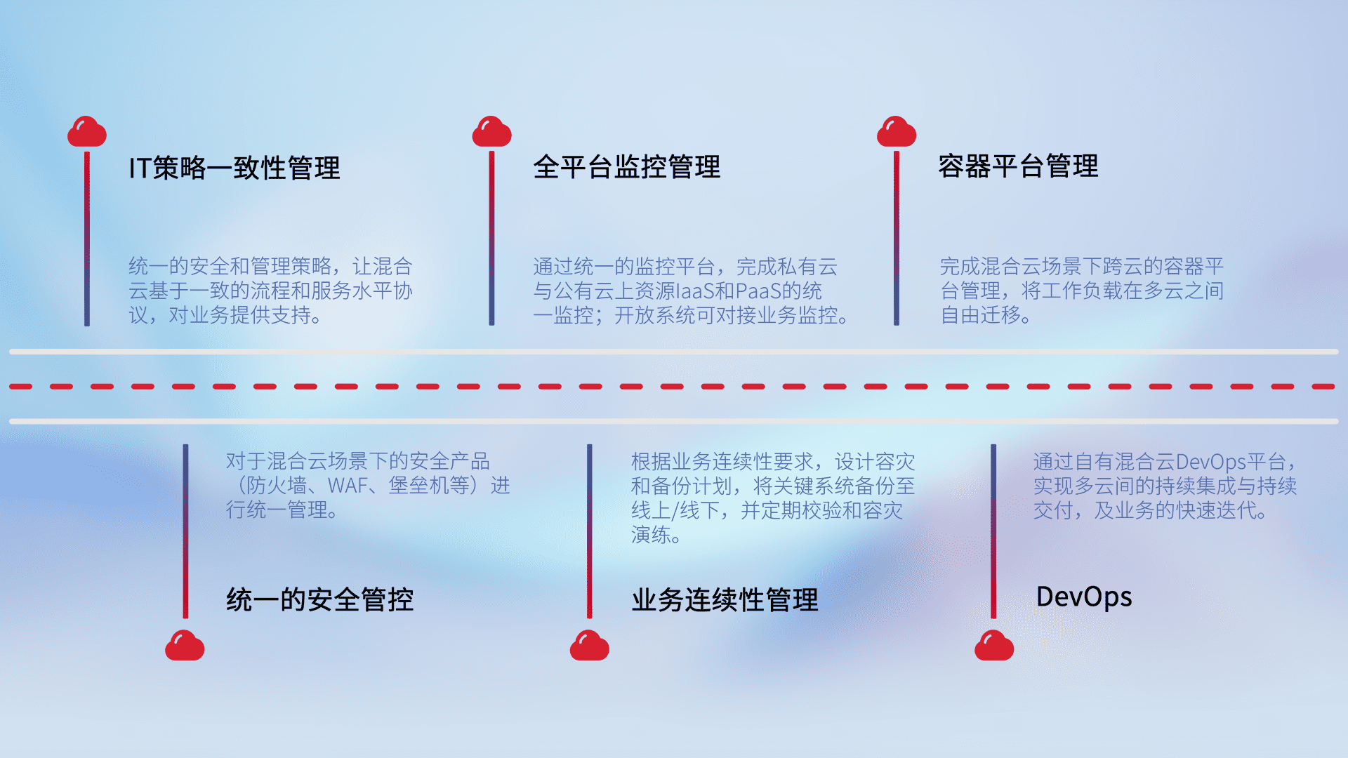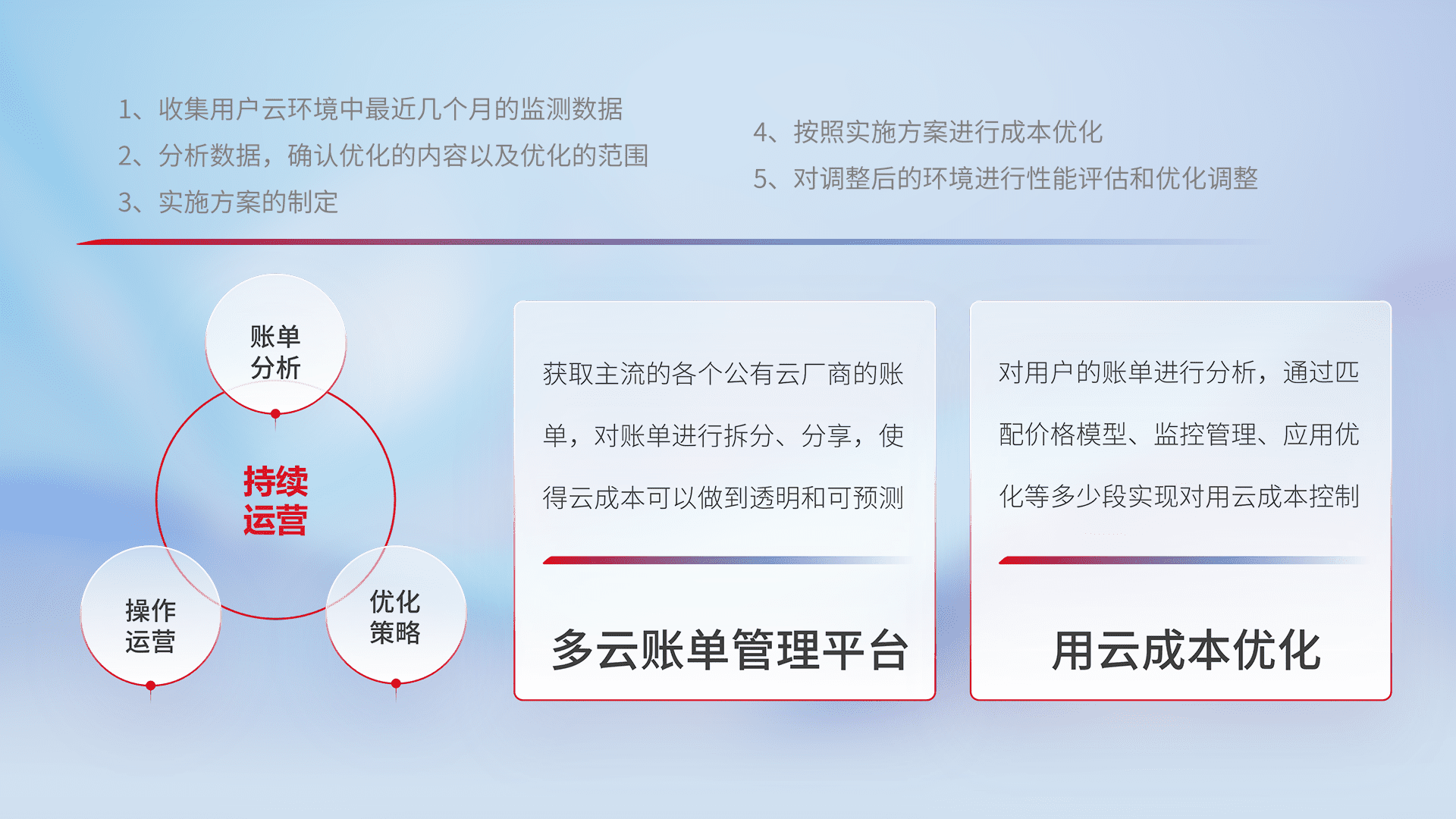 通过多云纳管,,,,以统一的资源数据模型把客户的云资源进行抽象和封装,,,,进而实现对多云资源的统一操作,,,,保障云资源管理的可靠性、、、稳定性与可用性。。量身定制化运维内容,,,,配置、、、开发运维、、补丁管理、、、、备份、、、监控、、认证和访问管理、、审计和日常巡检等,,保障在用云过程中的可靠度,,,,稳定度以及高可用率。。。